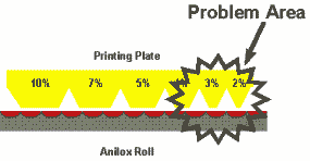 The reason for this is simple. You do not want the dot on your printing plate to be smaller than the cell on your anilox roll. If that occurs, the dot can actually enter the anilox cell, picking up excess ink. This phenomena is referred to as “dot dipping” and can lead to very dirty printing situations.