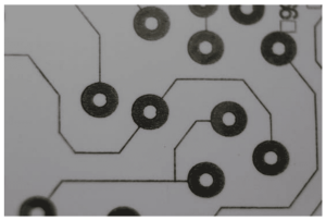 Inkjet: Inkjet uses a small nozzle to eject very fluid ink and deposit small droplets onto a substrate. Particles must be very small to pass through the inkjet nozzle with nano inks being most common. Trace lines and minimum print features are dependent on droplet size, but can range from 3-20 microns while the ink film thickness is determined by droplet size and number of passes. When compared to the aforementioned processes, inkjet is computer-intensive as each droplet is calculated and plotted. The necessary processing horsepower has traditionally limited the speed of the printing process.